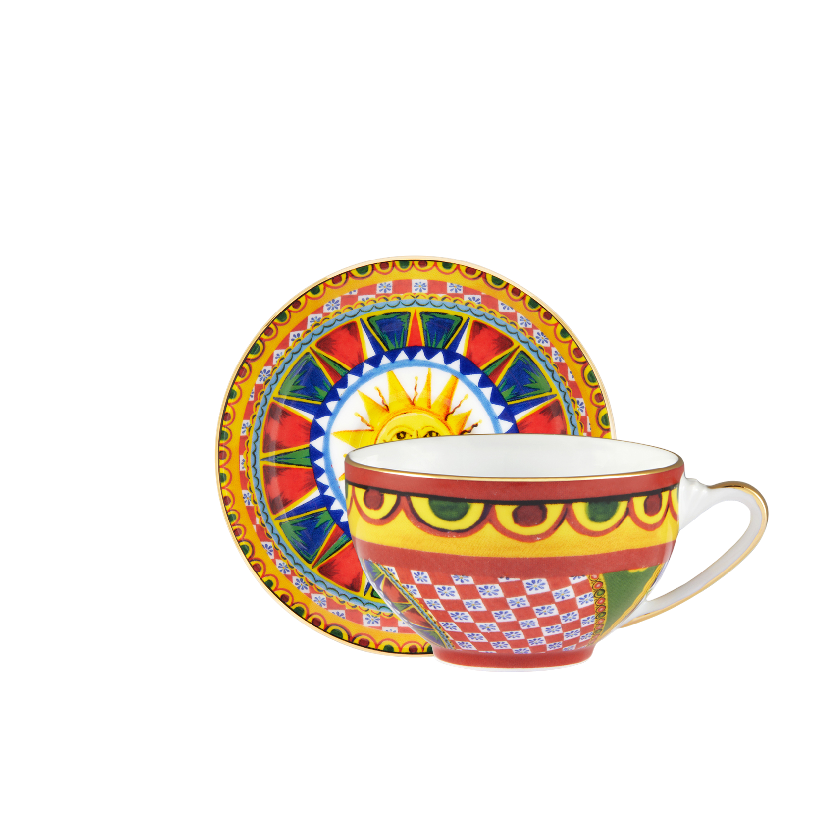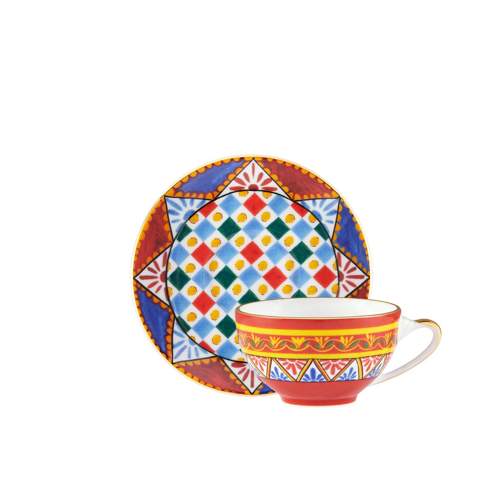 This elegant espresso cup and saucer, with a decorative motif inspired by a foulard print, is evocative of the Carretto Siciliano: a folkloric element from a place marked by traditions, artisanal craftsmanship, landscapes and unique colours which have always been at the heart of Dolce&Gabbana’s aesthetics.