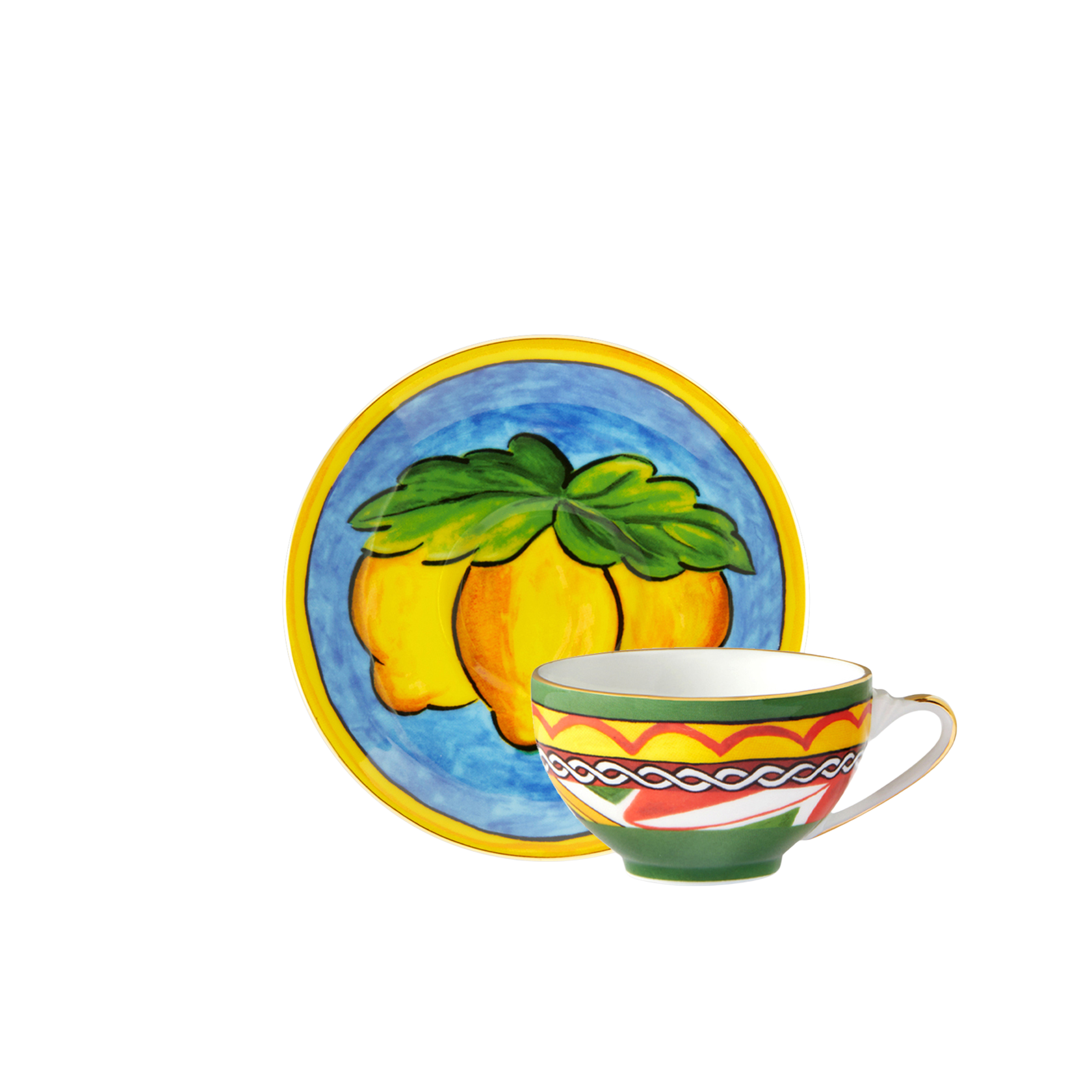 This elegant teacup and saucer, with a decorative motif inspired by a foulard print, is evocative of the Carretto Siciliano: a folkloric element from a place marked by traditions, artisanal craftsmanship, landscapes and unique colours which have always been at the heart of Dolce&Gabbana’s aesthetics.